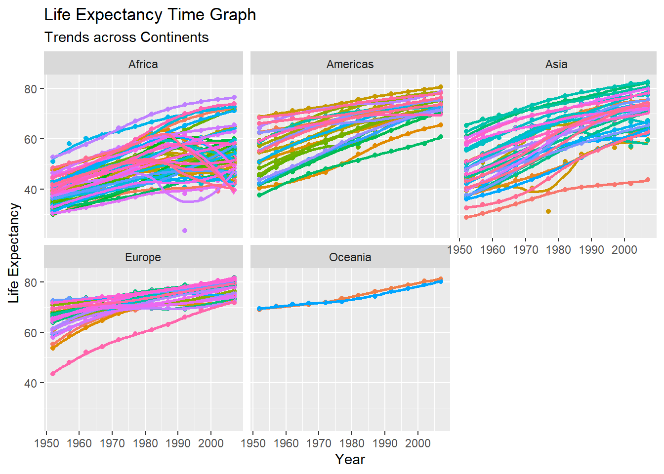 Basically, the life expectancy increases as time goes in all continents. Europe, Americas and Oceania started at a higher place in 1952, probably because they were relatively more developed at that time.