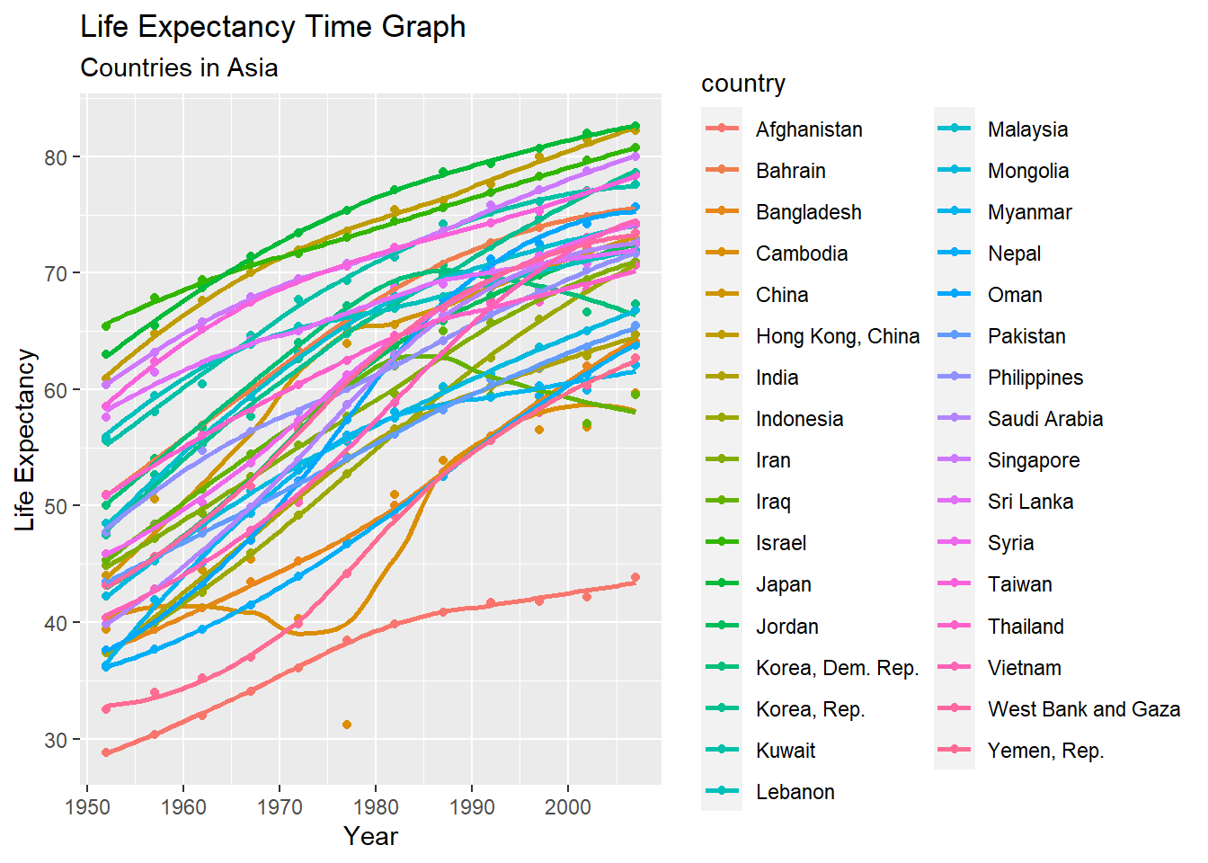 Secondly, I’d like to compare life expectancy changes amoung all countries in Asia.