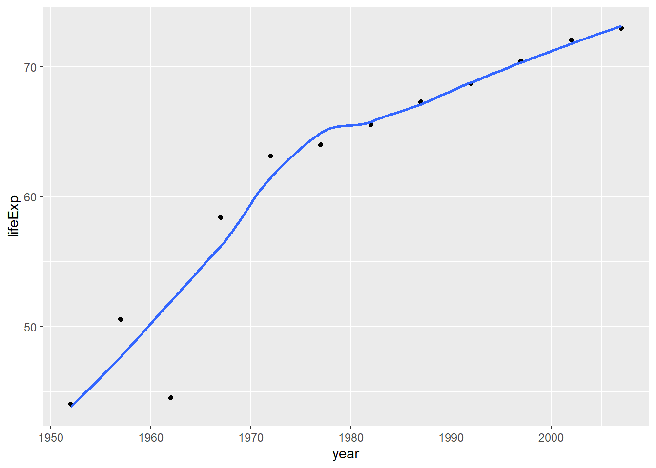 plot1 <- ggplot(data = country_data, mapping = aes(x = year, y = lifeExp))+