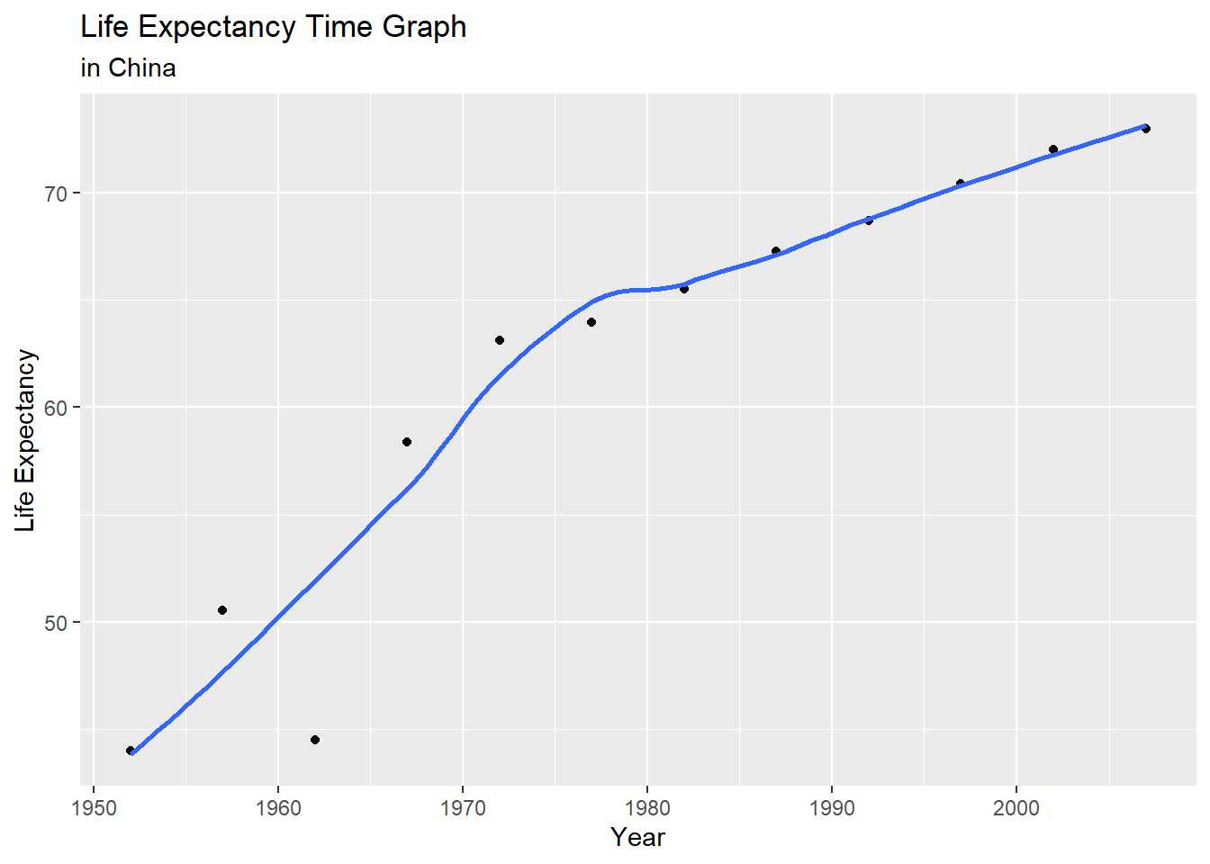 First of all, here’s the graph of life expectancy changing over time in China.